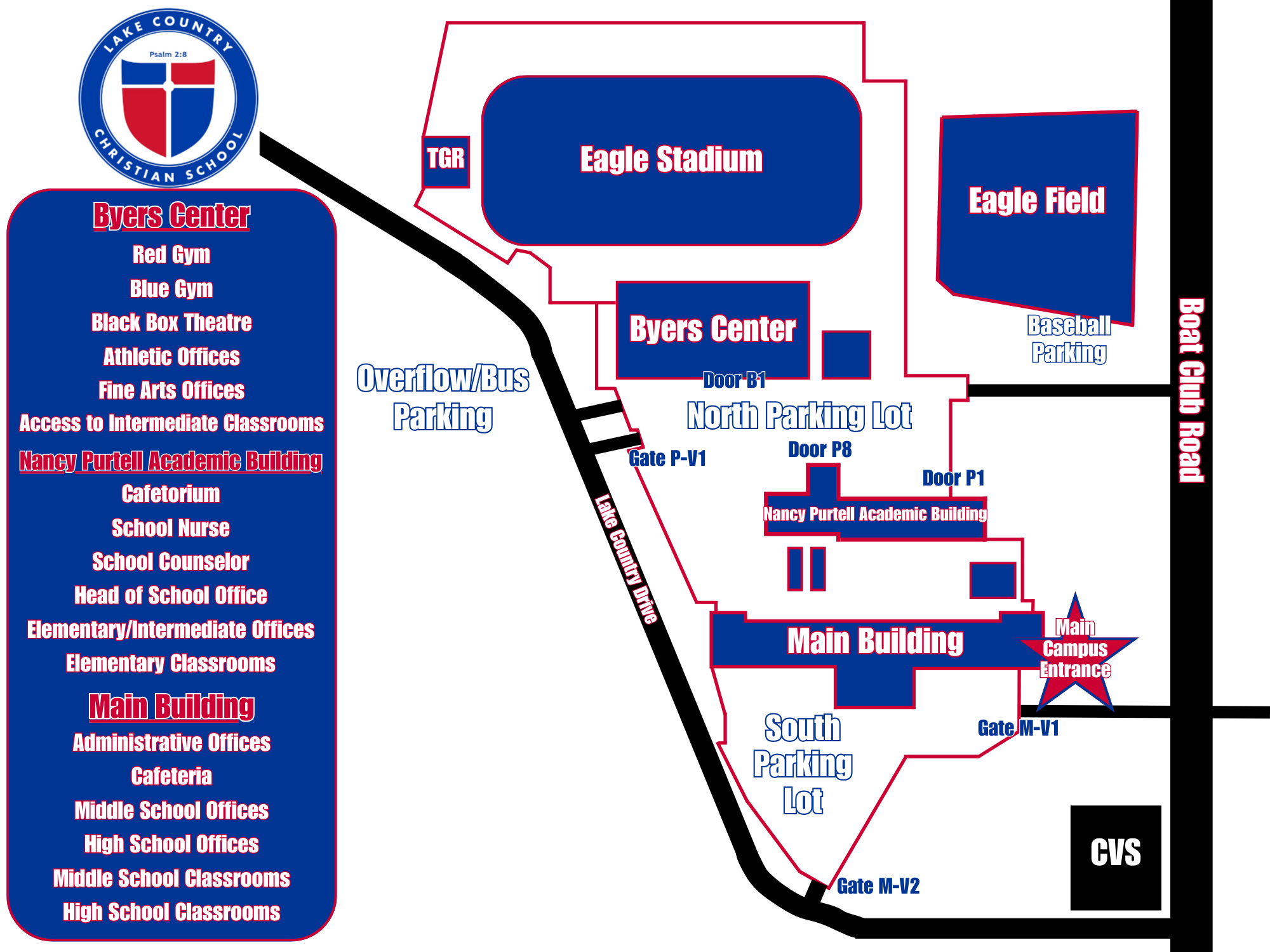 - Parking at Eagle Stadium or the Byers Center athletics/fine arts complex is accessible via Lake Country Drive. Use the second LCCS entrance on Lake Country Drive. Please note the one-way traffic flow.